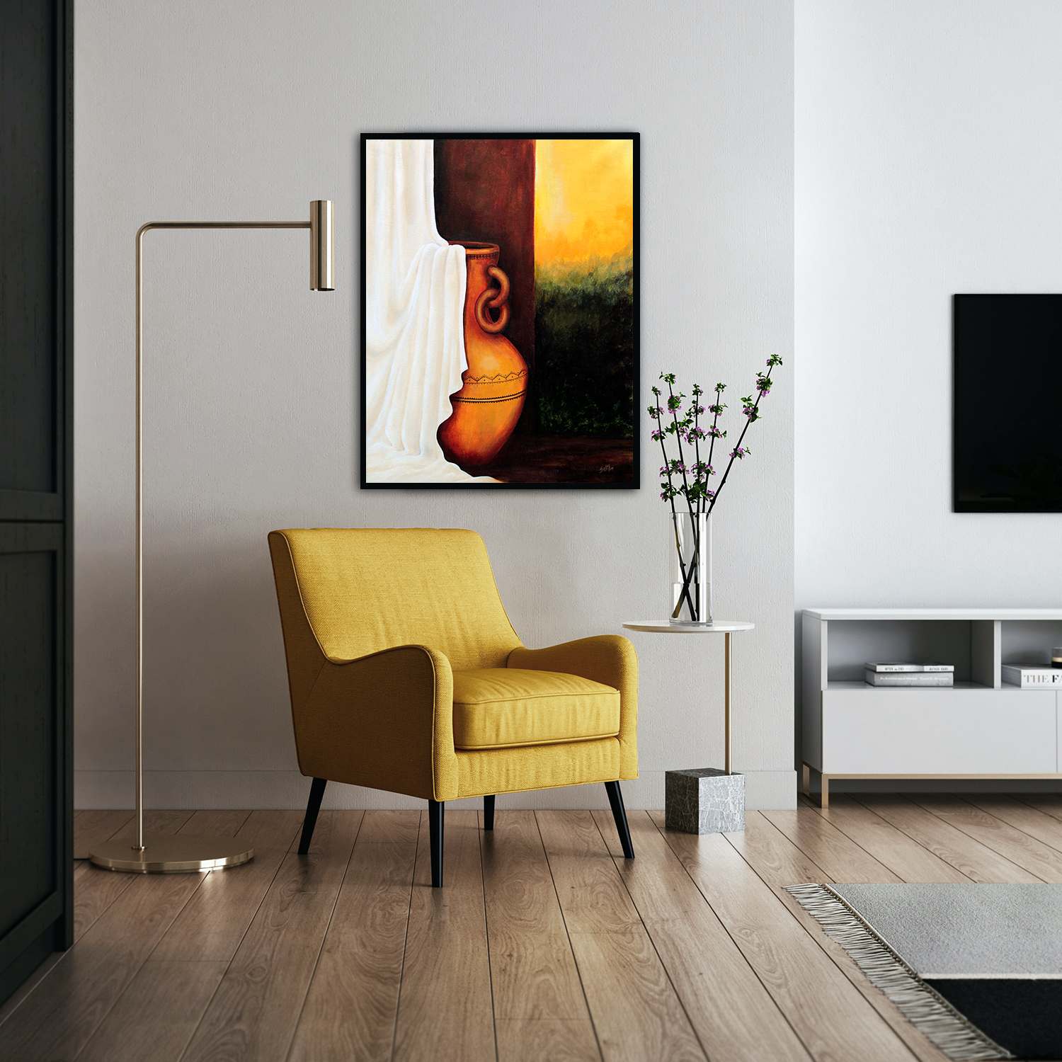 This painting has a quiet, contemplative beauty. The terracotta pot, with its earthy warmth and geometric detailing, feels rooted in tradition and craftsmanship, while the draped white cloth introduces softness and fluidity. The interplay between these two elementsβthe rigid, textured vessel and the gentle folds of fabricβcreates a dialogue between permanence and transience.