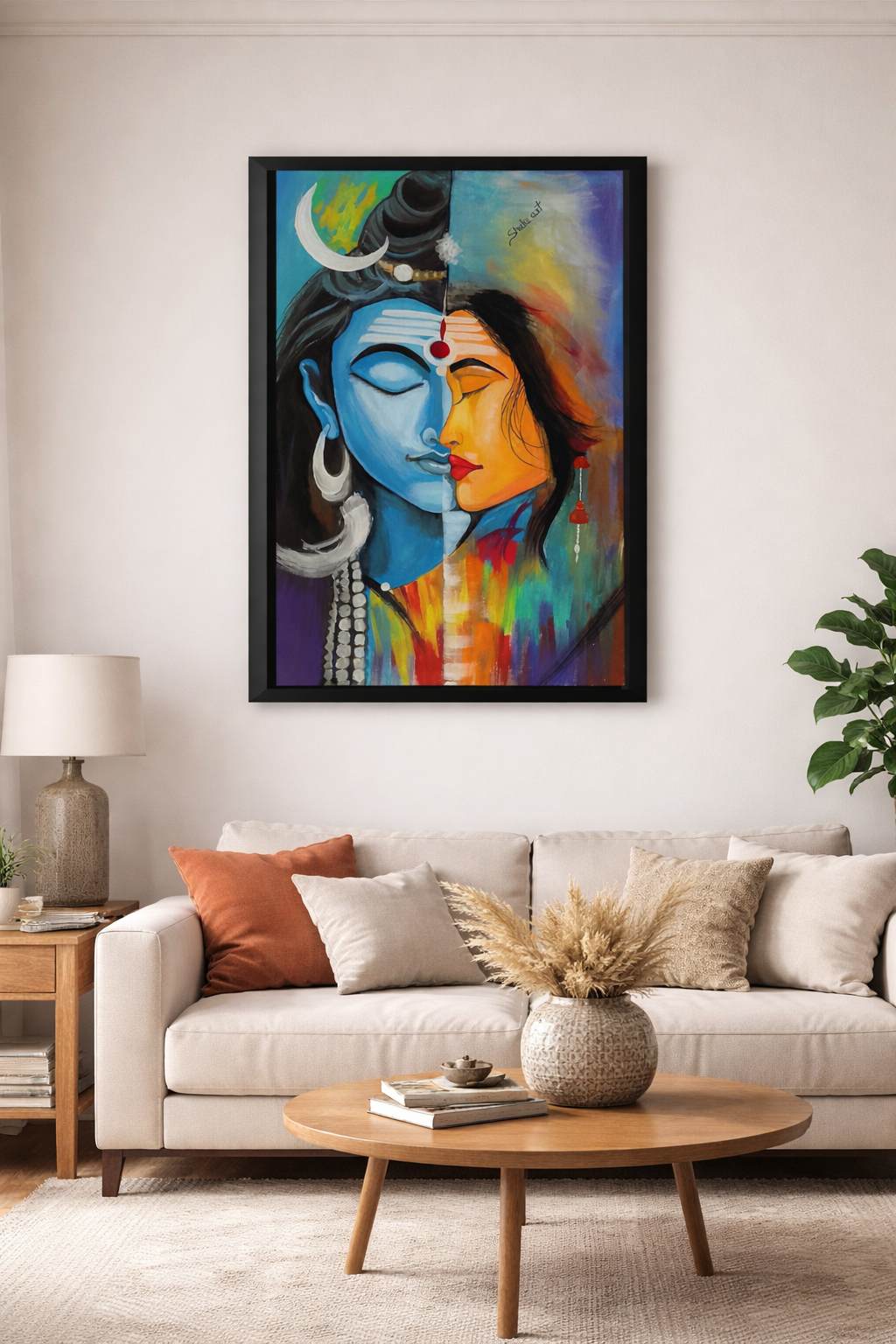 Ardhanarishwar represents the divine union of masculine and feminine energies, symbolizing balance, harmony, and completeness. This modern art interpretation blends traditional spiritual essence with contemporary design elements, using bold forms and abstract textures to depict the unity of Shiva and Shakti. The artwork reflects inner balance, duality, and the interconnected nature of existence, making it both spiritually meaningful and visually striking.